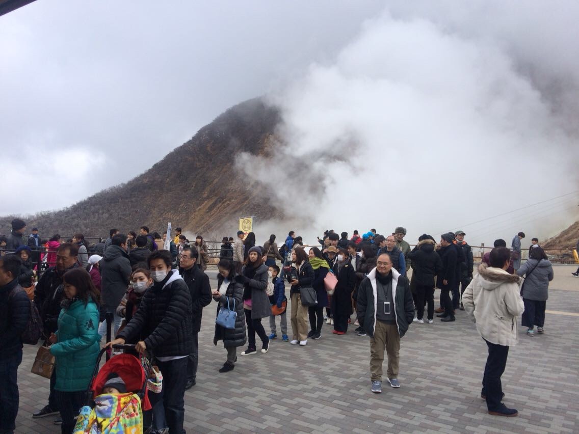 そして到着したのがこちらの大涌谷。大涌谷に到着すると、そこは活火山の煙がもくもくと地面から出ている山岳地帯であり、この日は曇りでもあったためか視界は残念な状況。ただ、皆こぞって火山活動をしている山肌をバックに写真を撮りまくり。これはこれで迫力もあって珍しい状況ではないのだろうか。