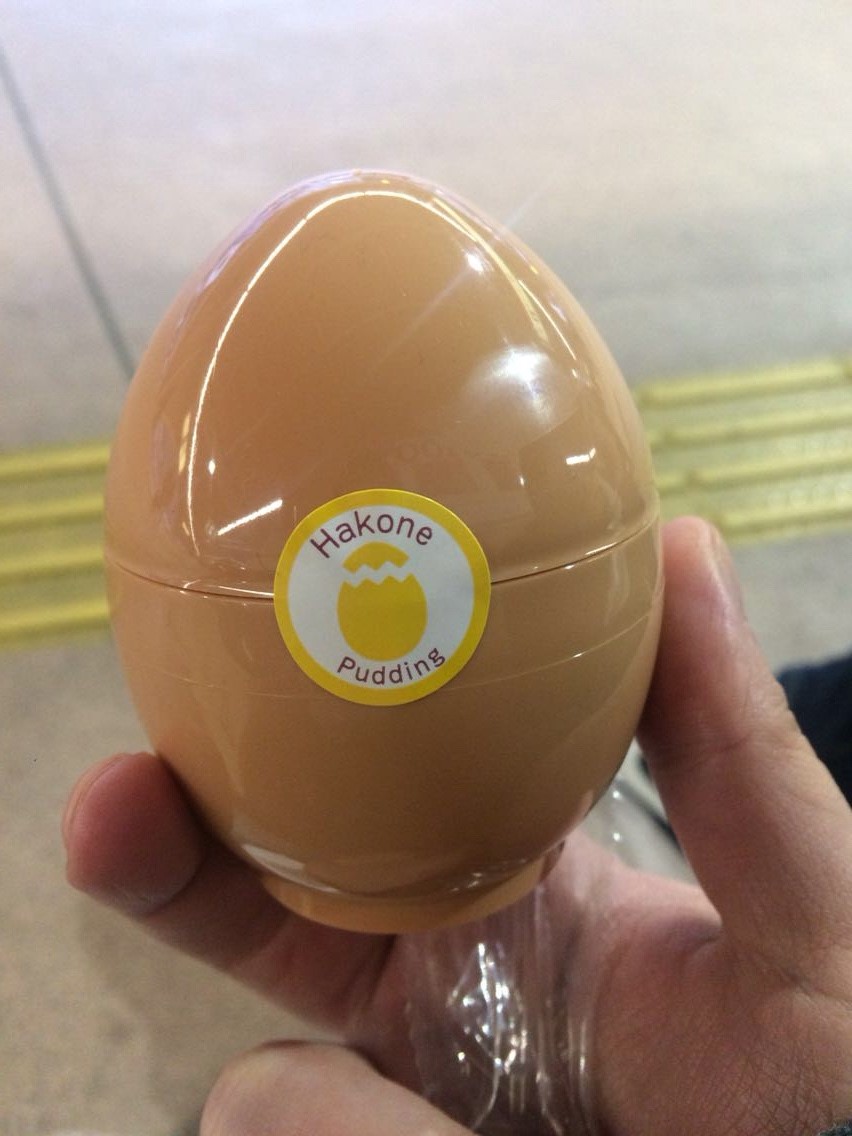 食事の後は、箱根土産を物色しつつ、箱根プリンを皆で食べる。箱根湯本駅構内で販売されている玉子型の器に入ったこちらのプリン。ちなみに、味は超濃厚タイプのプリン。美味しかったのは言うまでもなく。